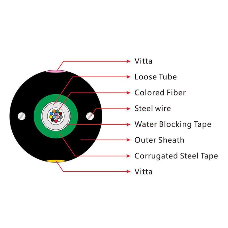 Lichte gewapende kabels, enkelvormige/multimode vezels worden geplaatst in een losse buis van een hoog modulus plastic.Het buisje is langszij met een laag PSP omwikkeldTussen de PSP en de losse buis wordt een waterdicht materiaal aangebracht om de kabel compact en waterdicht te houden. Twee parallelle stalen draden worden aan beide zijden van de stalen tape geplaatst.De kabel is afgesloten met een polyethyleen (PE) -slijm..