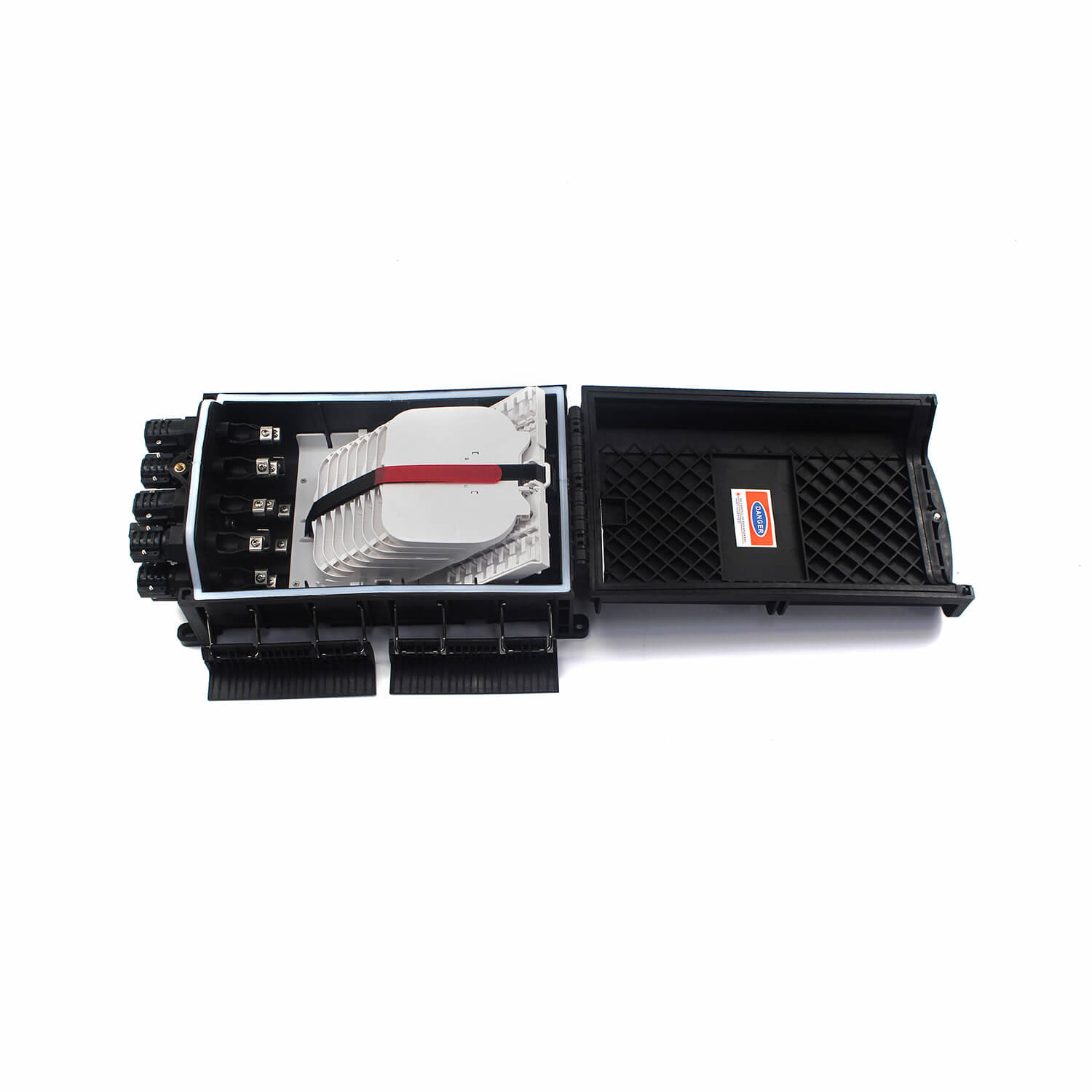 Optische vezel splice sluiting is in staat om tot 288 splicing punten als buiten sluiting te houden. waterdicht ontwerp met IP68 bescherming niveau. Volledig robuust ontwerp voor ondergrondse, paal / muur gemonteerd.Het wordt gebruikt als splicing punt voor de voedingskabel om verbinding te maken met de distributiekabel in het FTTx backbone netwerk systeem Het combineert vezelsplitsing, opslag en kabelbeheer in één solide beschermde doos.