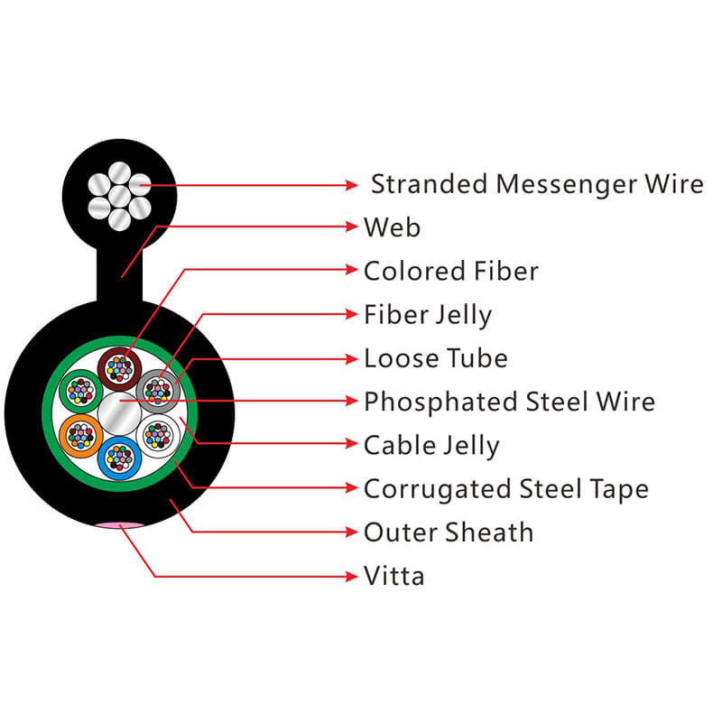De vezels worden geplaatst in een losse buis van hoog modulus plastic, die is gevuld met een waterbestendige vulstof.Een stalen draad bevindt zich in het midden van de kern als een metalen sterkte lid. De buizen (en vulstoffen) worden om het sterkte-element in een compacte en cirkelvormige kabelkern gestreken.dit deel van de kabel, vergezeld van de gestreepte draden als ondersteunend deel, wordt aangevuld met een polyethyleen (PE) -slijm om de figuur 8-structuur te vormenDit soort kabels wordt specifiek toegepast voor zelfdragende luchtinstallaties.